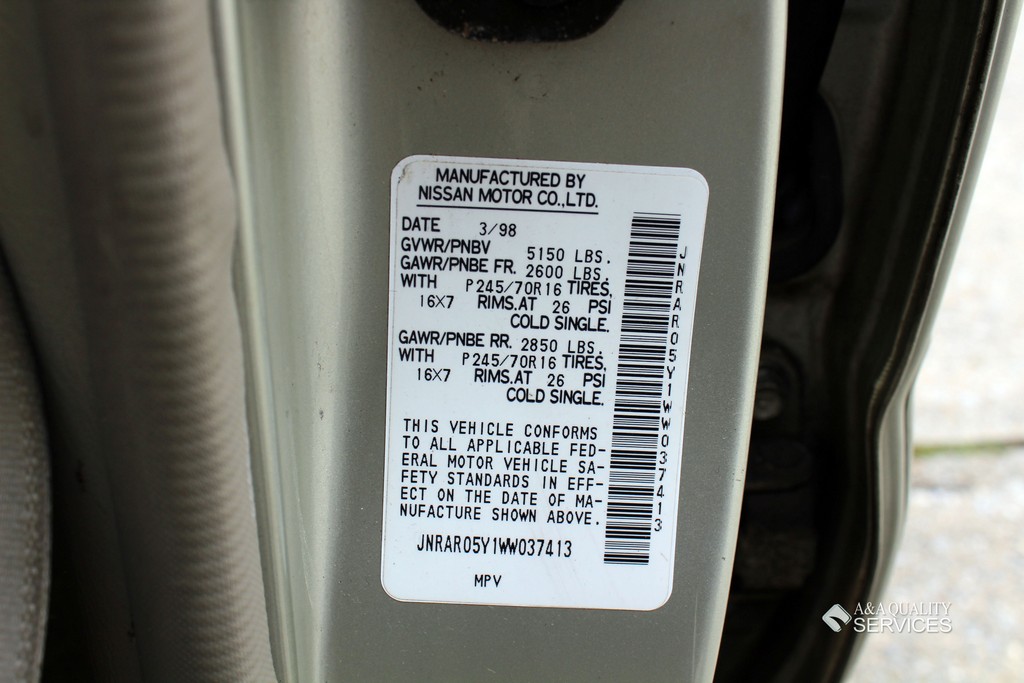 | Transmission: | Automatic | Engine: | 6 Cylinder 3.3 Liter | VIN: | JNRAR05Y1WW037413 |