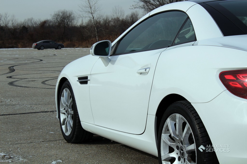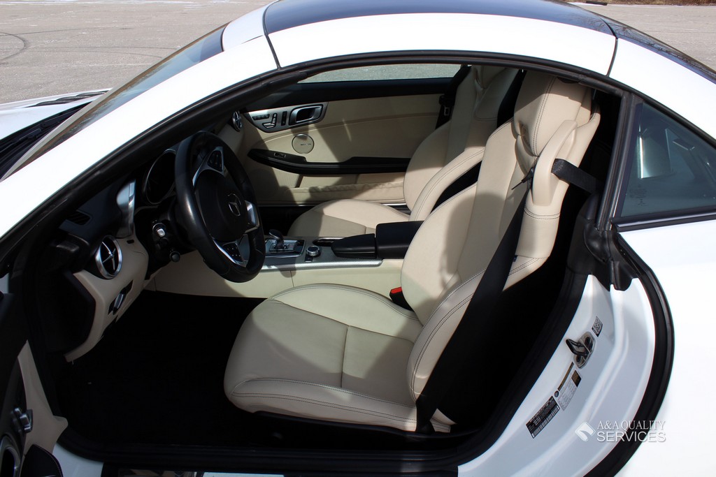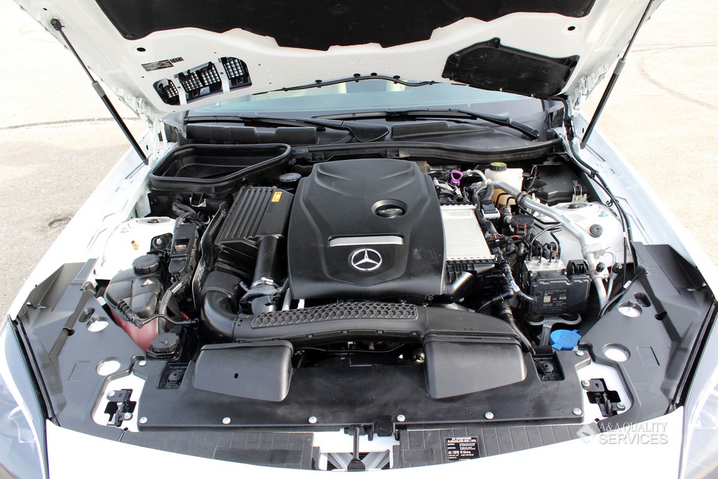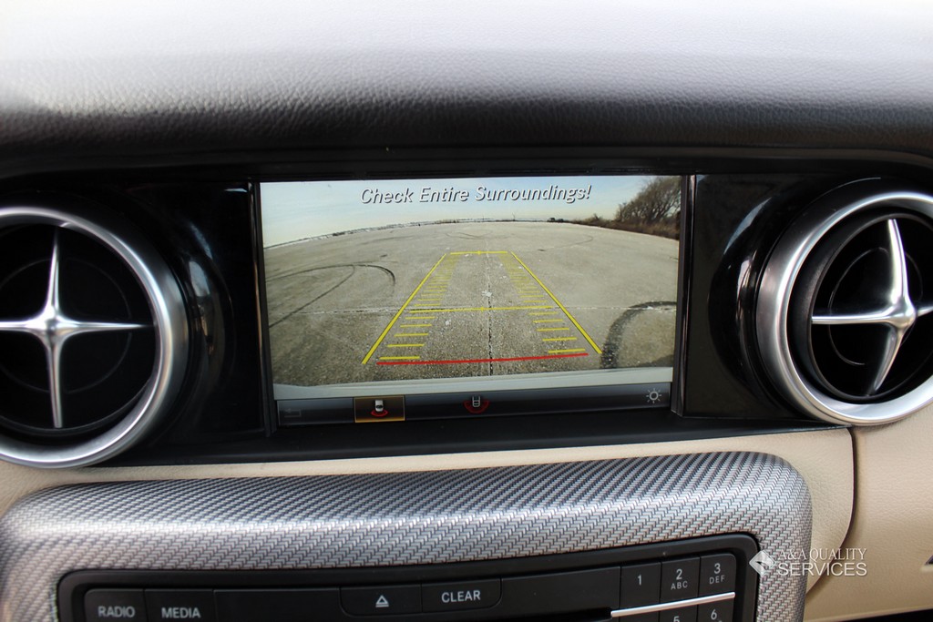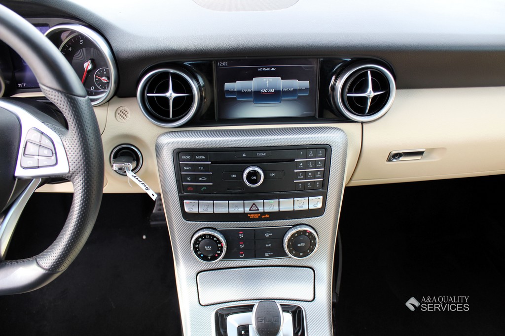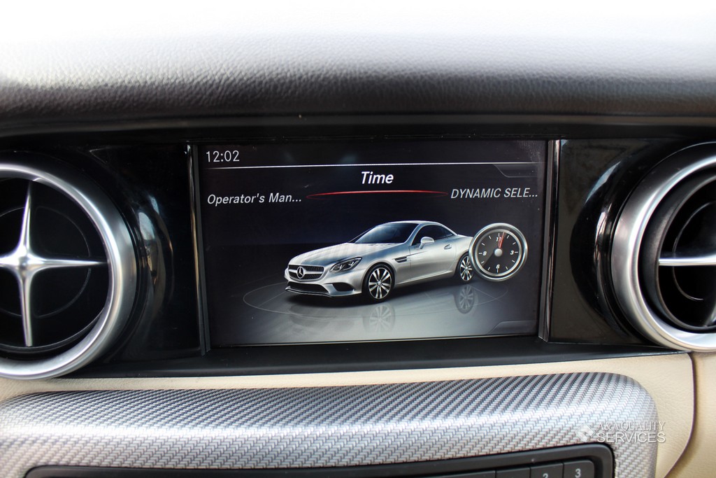 Standard features for the SLC300 include 17-inch alloy wheels, a power-retractable hardtop with a fixed glass roof panel, xenon headlights, LED daytime running lights and taillights, a dual-mode exhaust system, power-folding heated mirrors, automatic wipers, a rearview camera, eight-way power seats with memory functions, a tilt-and-telescoping steering wheel, MB-Tex premium vinyl upholstery, automatic climate control, selectable driving modes and a driver information screen. Entertainment features consist of a 7-inch central display screen, Bluetooth and an eight-speaker audio system with HD radio, two USB ports and an SD card slot.